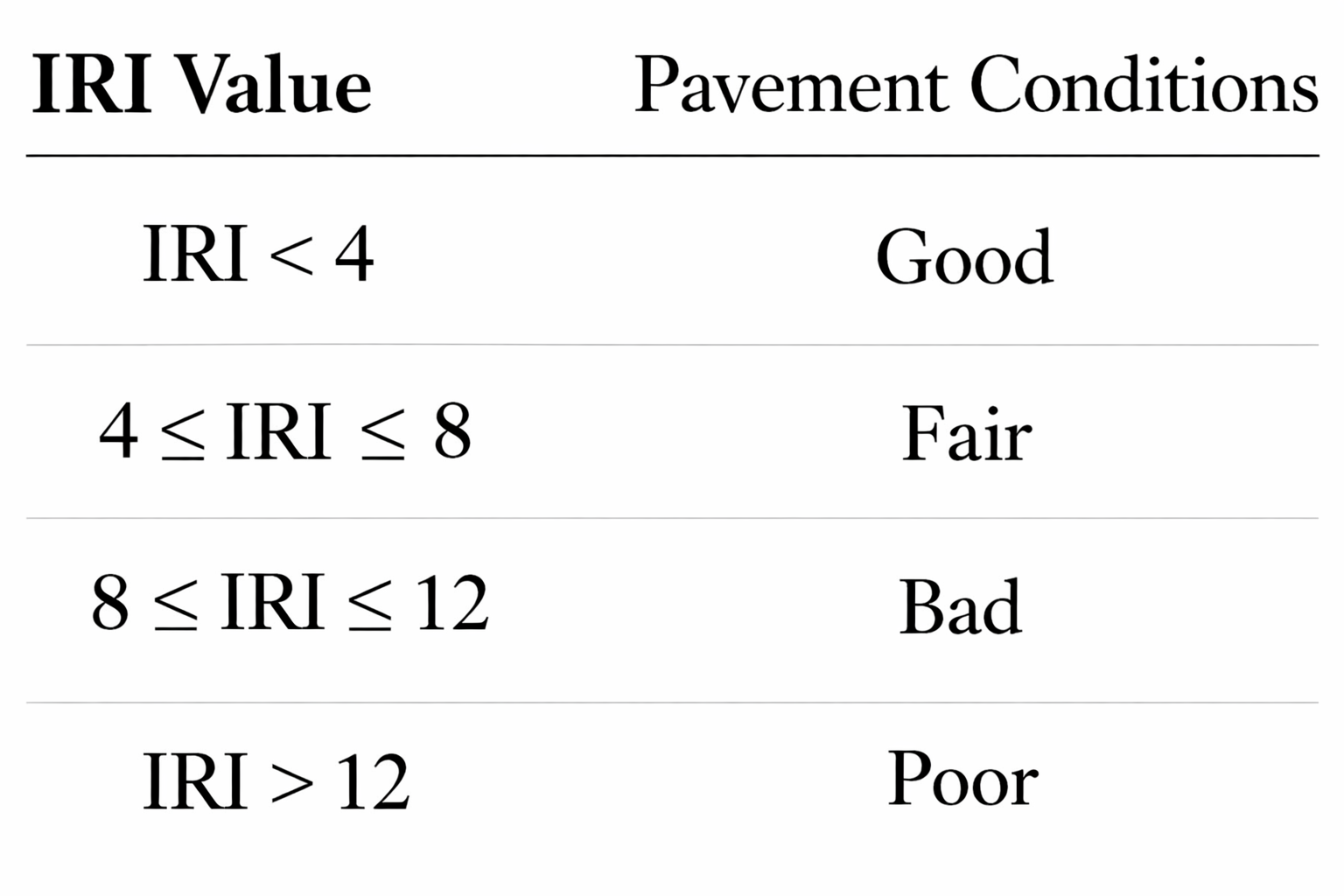 Global highway agencies use IRI thresholds to classify pavement condition into performance categories. These thresholds are designed based on the relationship between road roughness and its impact on users and infrastructure systems.